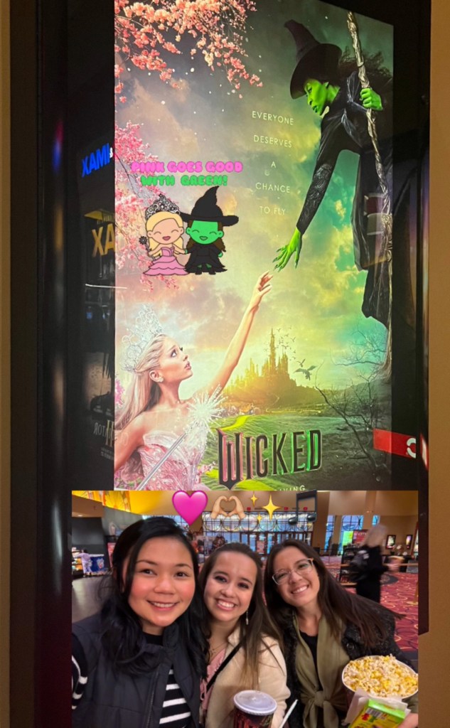 Rated 88% on Rotten Tomatoes, the cast and crew did a fabulous job bringing the stage story onto the big screen. On that note, I applaud the diversity and representation in this film. The cast is studded with big-names like Ariana Grande as Glinda, Cynthia Erivo as Elphaba, Jonathan Bailey as Prince Fiyero, and more. I loved the Asian-American representation, with the iconic Michelle Yeoh playing Madame Morrible, and SNL’s ever-talented Bowen Yang playing Shiz Academy student Pfannee. Marissa Bode, an LA-based disabled actress, made her feature film debut as Elphaba’s sister Nessarose, whose character uses a wheel-chair.